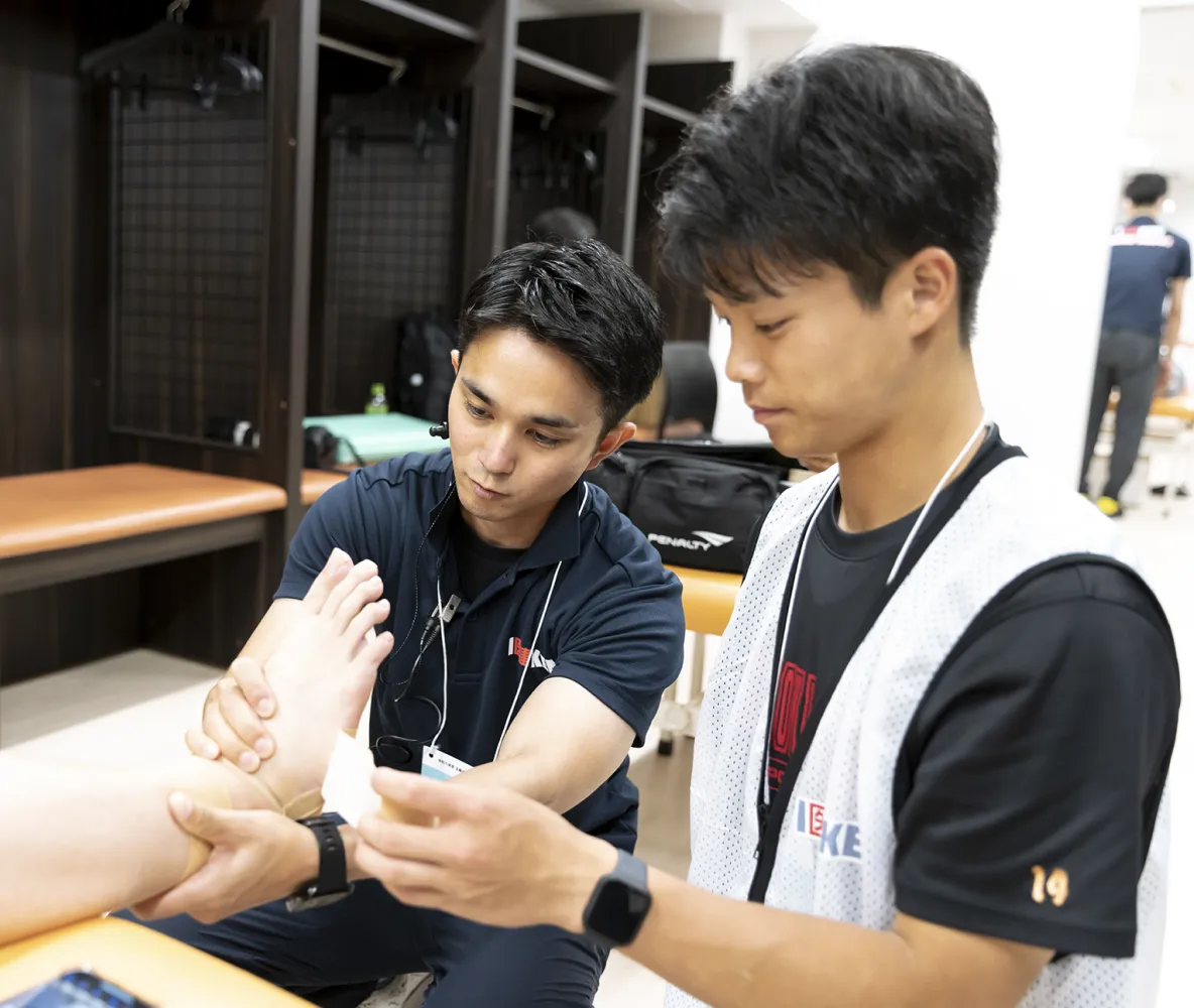 ケガのケア、テーピング、コンディショニングサポート… 世界の舞台で活躍する選手たちと関わりながら、 アスレティックトレーナーの仕事をリアルに学べる貴重な経験。 「学生のうちから海外チームをサポートできる」 これが福岡医健のATコースの強みです。