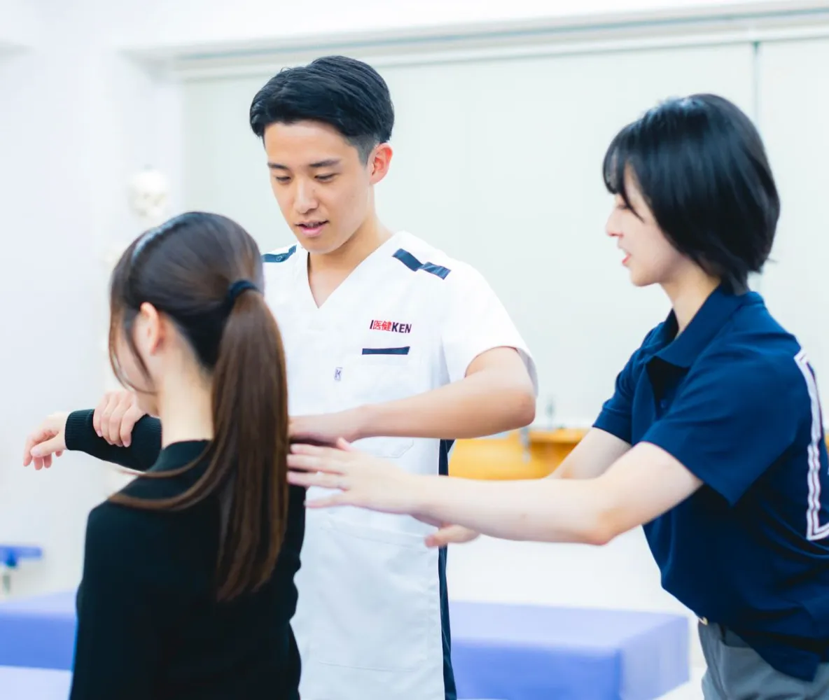 福岡医健の学内には柔道整復の施術を目的をした整骨院があります。授業の一環として、指導者のもとで患者様と最初から最後まで接し、臨床能力とコミュニケーション能力を実践的に習得します。