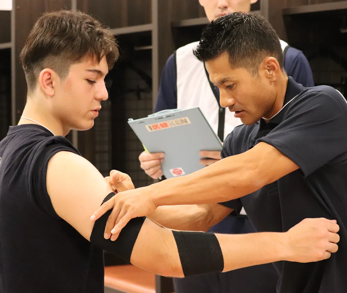 ケガのケア、テーピング、コンディショニングサポート… 世界の舞台で活躍する選手たちと関わりながら、 アスレティックトレーナーの仕事をリアルに学べる貴重な経験。 「学生のうちから海外チームをサポートできる」 これが福岡医健のATコースの強みです。