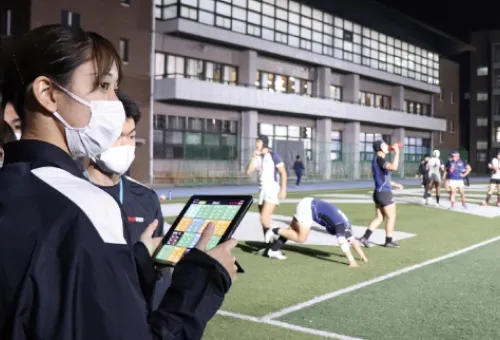全国高校ラグビー大会に出場した東福岡高等学校に同行して、GPS搭載のKnowsを使用。体調管理や試合の撮影・分析などを行います。データ分析ができるトレーナーが現場では求められています。